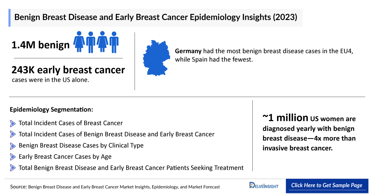 - The total Benign Breast Disease and Early Breast Cancer Incidence Cases in the 7MM comprised approximately 2.9 million and 544,200 cases respectively, in 2023 and are projected to increase during the forecasted period.