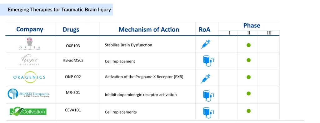 Companies are investigating different routes of administration for TBI treatment. Oragenics (ONP-002), Beyond Barriers Therapeutics (BBT-101), and Noveome (ST266) are exploring intranasal delivery, while Neuroplast (Neuro-Cells) is focusing on intrathecal injection as a potential approach. Apart from these, other TBI drugs in clinical trials include OXE103 (Oxeia Biopharmaceuticals), HB-AdMSCs (Hope Biosciences), CEVA101 (Cellvation), MR-301 (SHINKEI Therapeutics), and others.