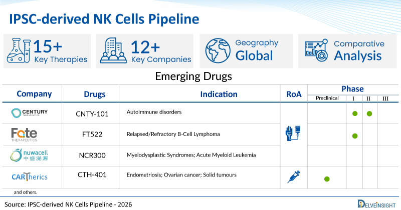 The report provides insights into different therapeutic candidates in phase II, I, preclinical and discovery stage. It also analyses IPSCs derived NK cells therapeutic drugs key players involved in developing key drugs.