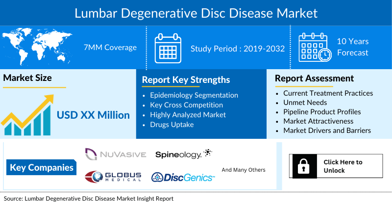 The Lumbar Degenerative Disc Disease market report provides current treatment practices, emerging drugs, Lumbar Degenerative Disc Disease market share of the individual therapies, current and forecasted Lumbar Degenerative Disc Disease market Size from 2019 to 2032 segmented by seven major markets. The Report also covers current Lumbar Degenerative Disc Disease treatment practice/algorithm, market drivers, market barriers and Lumbar Degenerative Disc Disease unmet needs to curate best of the opportunities and assesses the underlying potential of the market.