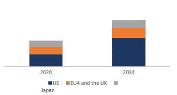 - Distribution of historical and current patient share based on real-world prescription data along with reported sales of current treatment in the US, EU4 (Germany, France, Italy, and Spain), the United Kingdom, and Japan.