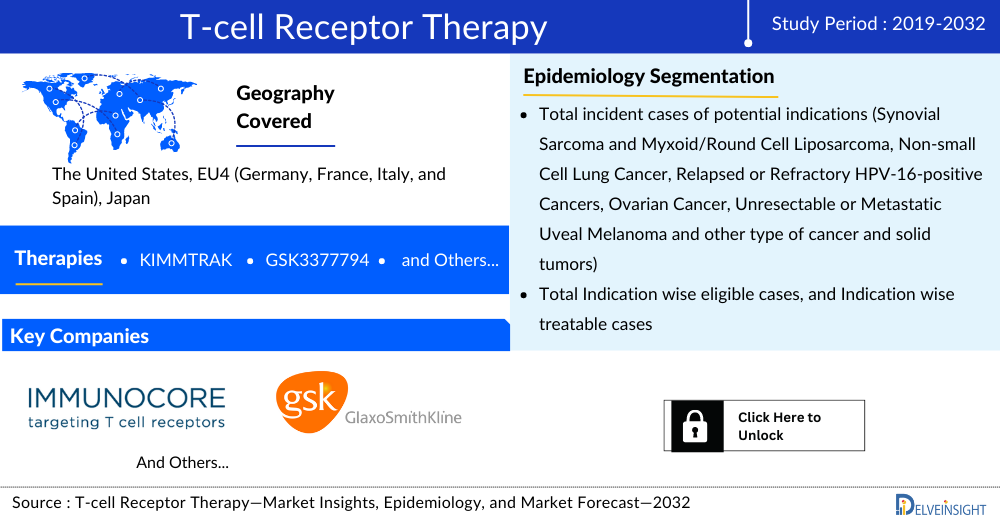 - The disease epidemiology covered in the report provides historical as well as forecasted T-cell Receptor Therapy epidemiology [segmented as Total incident cases of potential indications (Synovial Sarcoma and Myxoid/Round Cell Liposarcoma, Non-small Cell Lung Cancer, Relapsed or Refractory HPV-16-positive Cancers, Ovarian Cancer, Unresectable or Metastatic Uveal Melanoma and other type of cancer and solid tumors), Total Indication wise eligible cases, and Indication wise treatable cases] in the 7MM covering the United States, EU4 (Germany, Spain, Italy, and France) and the United Kingdom, and Japan from 2019 to 2032.