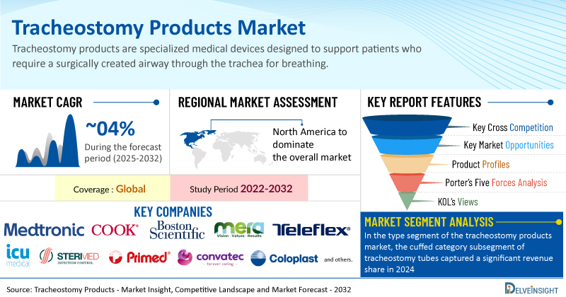 - Leading Tracheostomy Products companies include Medtronic, Cook, Boston Scientific Corporation, MERA, Teleflex Incorporated, ICU Medical, Inc., Sterimed Group, Primed® Halberstadt Medizintechnik GmbH, Convatec Group PLC, Coloplast Group, Fuji Systems Corporation, ANGIPLAST PRIVATE LIMITED, Well Lead Medical Co., Ltd., Fisher & Paykel Healthcare Limited, Troge Medical GmbH, TRACOE Medical GmbH, AdvaCare Pharma, Romsons, Pulmodyne, Inc., and others.