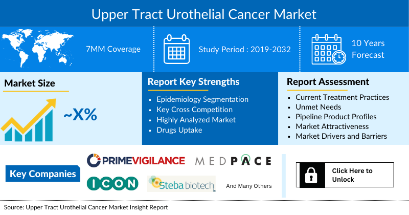 The Upper Tract Urothelial Cancer market report provides current treatment practices, Upper Tract Urothelial Cancer emerging drugs, Upper Tract Urothelial Cancer market share of the individual therapies, and current and forecasted Upper Tract Urothelial Cancer market Size from 2019 to 2032 segmented by seven major markets. The Report also covers current Upper Tract Urothelial Cancer treatment practice/algorithm, market drivers, market barriers and Upper Tract Urothelial Cancer unmet needs to curate the best of the opportunities and assesses the underlying potential of the Upper Tract Urothelial Cancer market.
